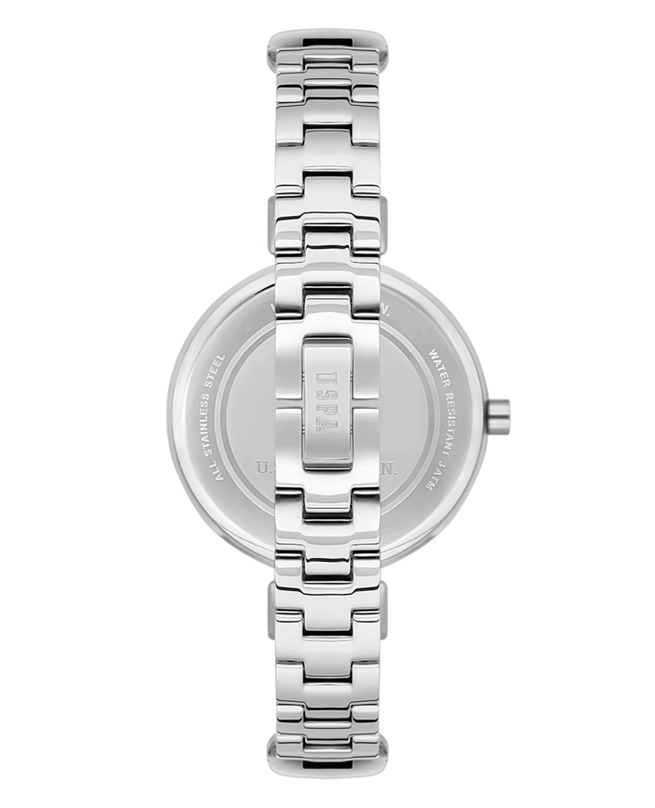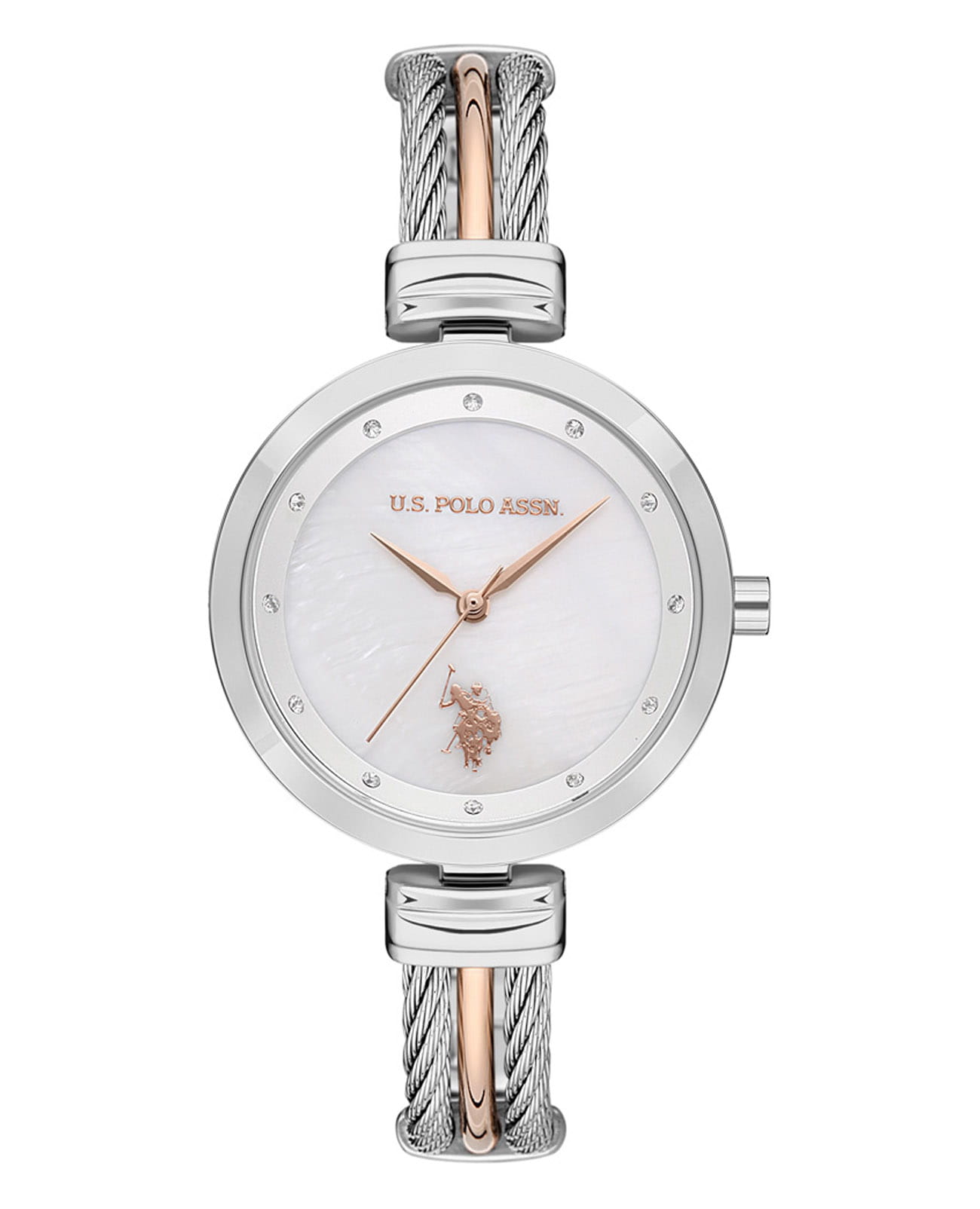 Женские часы U.S. Polo Assn Stile USPA2029-04, кварцевый механизм с высокой точностью. Минеральное стеклоМинеральное стеклоМинеральное стекло представляет собой искусственно выращенный минерал кварца. Такое стекло отличается особой устойчивостью к повреждениям и царапинам. Уступает по некоторым качествам сапфировому стеклу. устойчивое к появлению царапин, обладающее высокой прозрачностью. Корпус изготовлен из нержавеющей стали. Циферблат украшен кристаллами. Класс водозащиты: 50 метров, позволит защитить корпус от случайных брызг или капель дождя. Стальной браслет с частичным IP-покрытиемIP-покрытиеМетод ионного напыления. Демонстрирует повышенную устойчивость к истиранию, окислению и химическим веществам. Под воздействием высокого давления и температуры около 1500°C молекулы металла надёжно соединяются с частицами корпуса часов. на ювелирной застёжке.