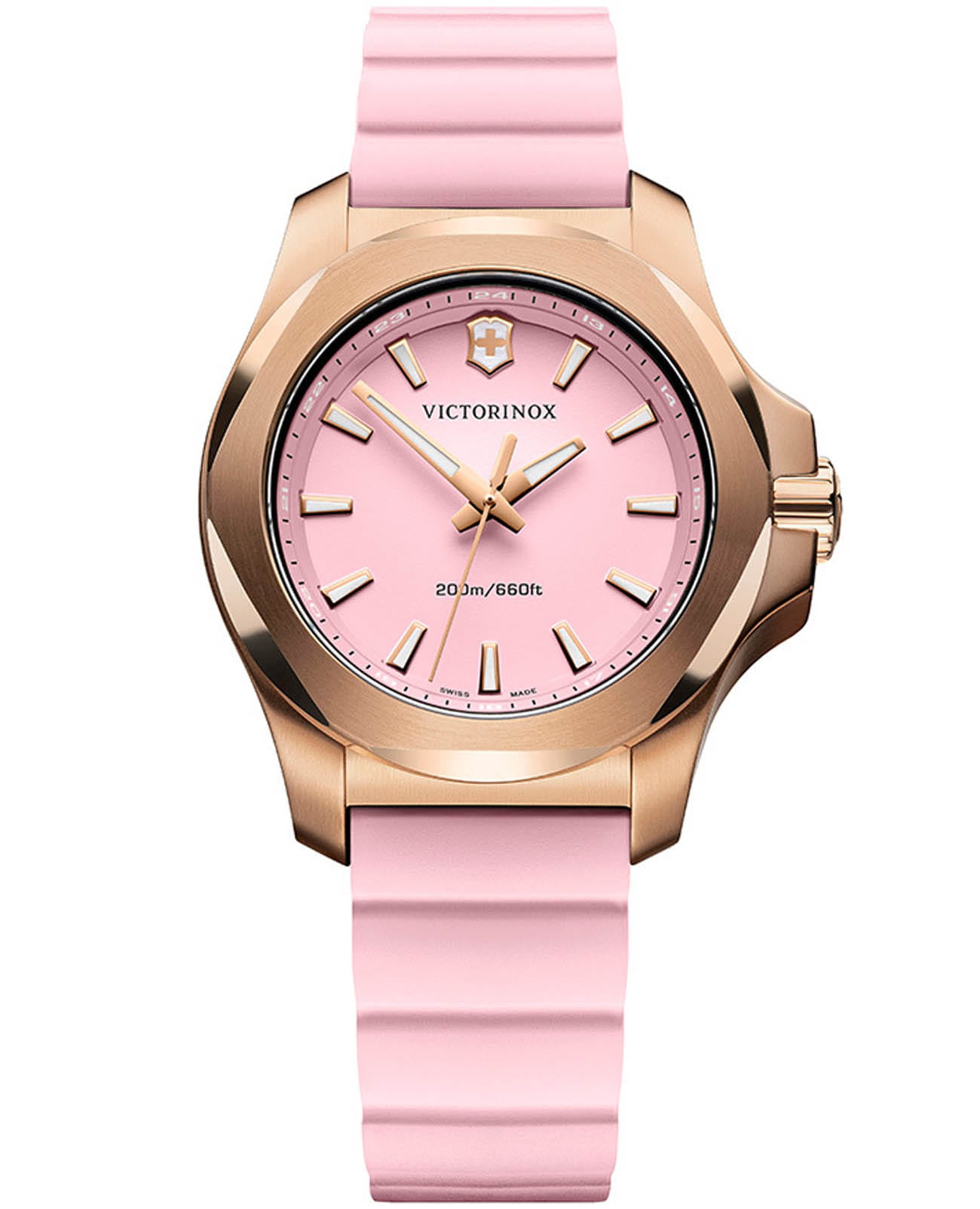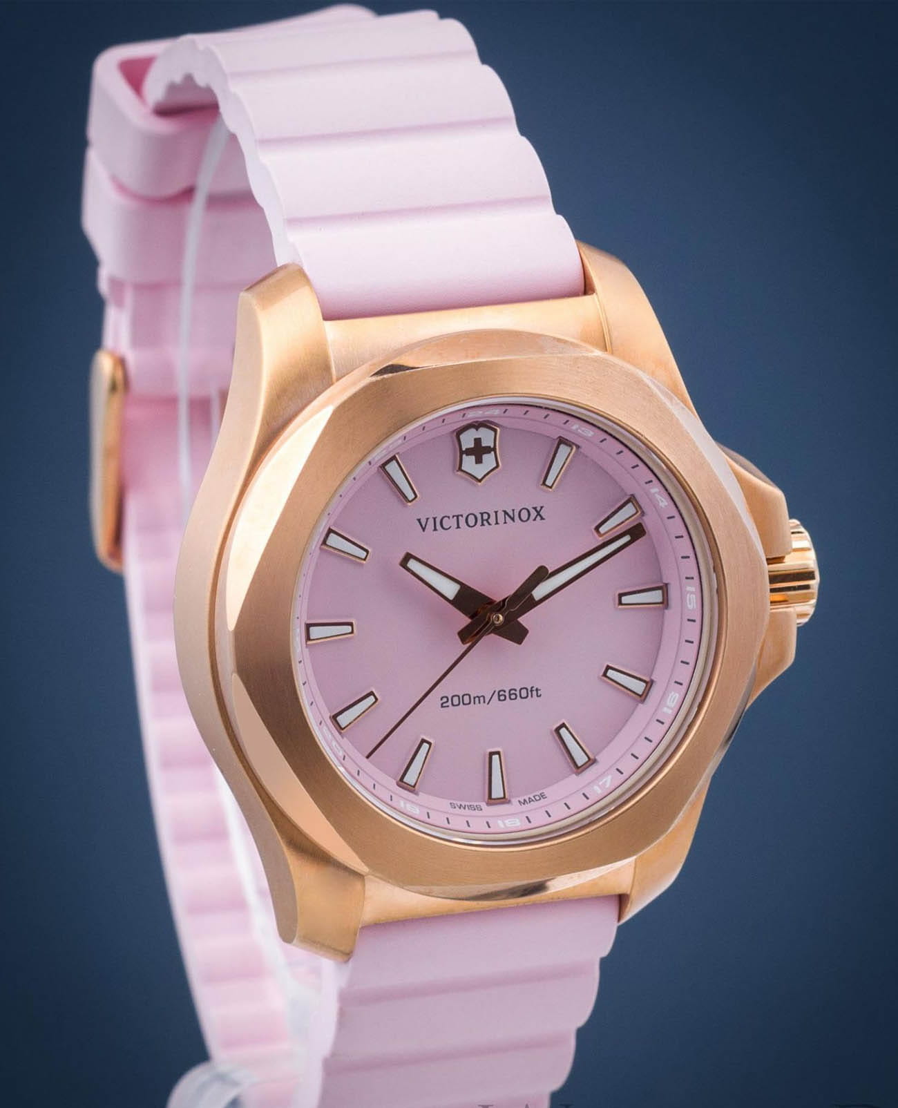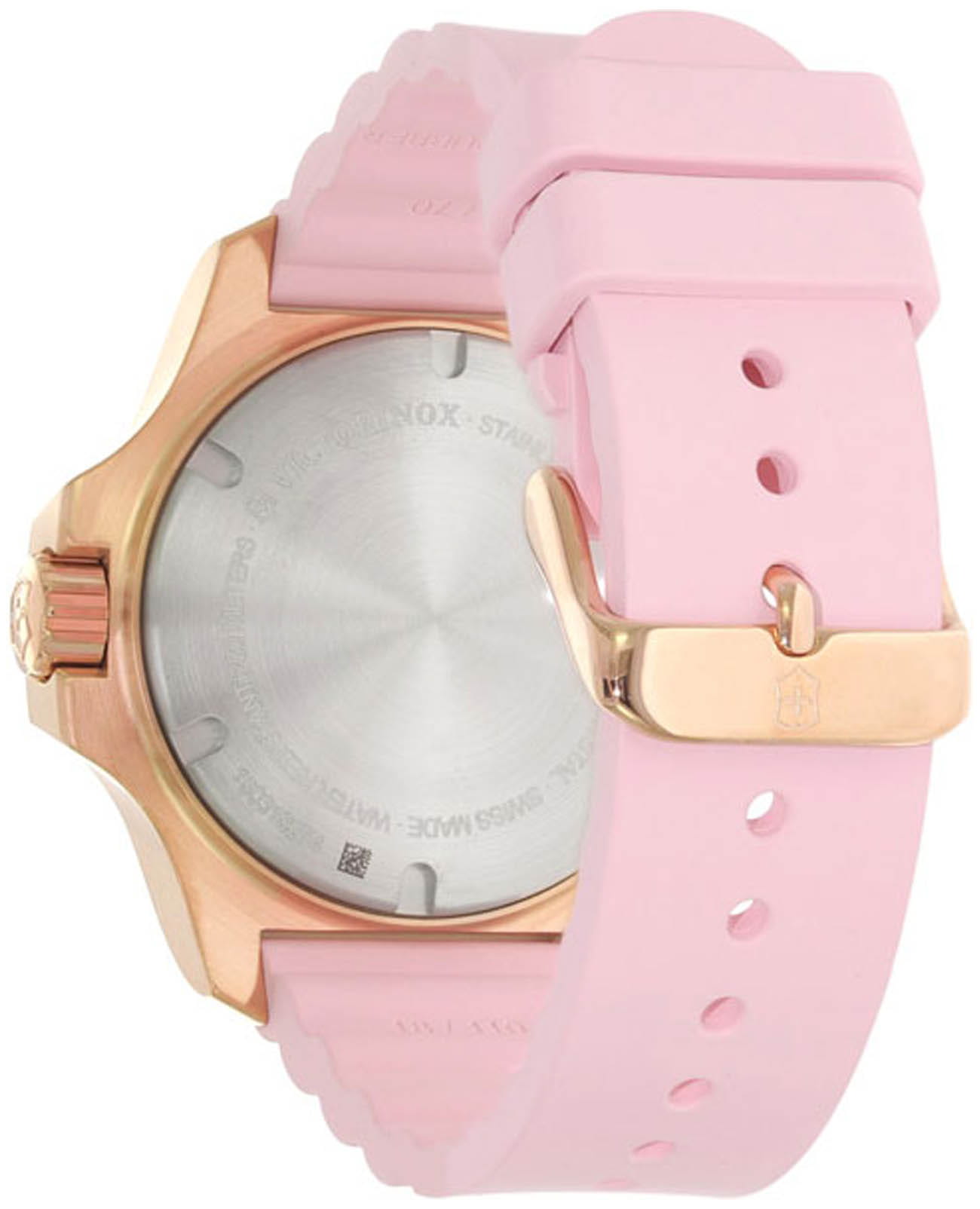 Женские швейцарские часы Victorinox I.N.O.X. V 241807. Сапфировое стеклоСапфировое стеклоПрочный и надёжный материал из кристалла сапфира синтетического происхождения, характеризующийся особой твёрдостью и устойчивостью к царапинам и повреждениям. с трёхслойным антибликовым покрытием. Корпус часов выполнен из нержавеющей стали 316L с PVD-покрытиемPVDУльтратонкое покрытие наносится в технике вакуумного напыления, сочетает в себе нитрид титана особой прочности со слоем золота или оксида хрома. Несёт в себе декоративную или защитную функцию.. Практичный каучуковый ремешок на стандартной застёжке. Влагозащита: 200 метров, позволит плавать, нырять и заниматься другими водными видами спорта. Стрелки и метки с люминесцентным покрытиемЛюминесцентное покрытиеПозволяет считывать показания времени в темноте. Производители наносят на стрелки, часовые индексы, безель или поверхность циферблата светонакопительный состав, дающий холодное свечение.. В комплекте съемный защитный бампер.