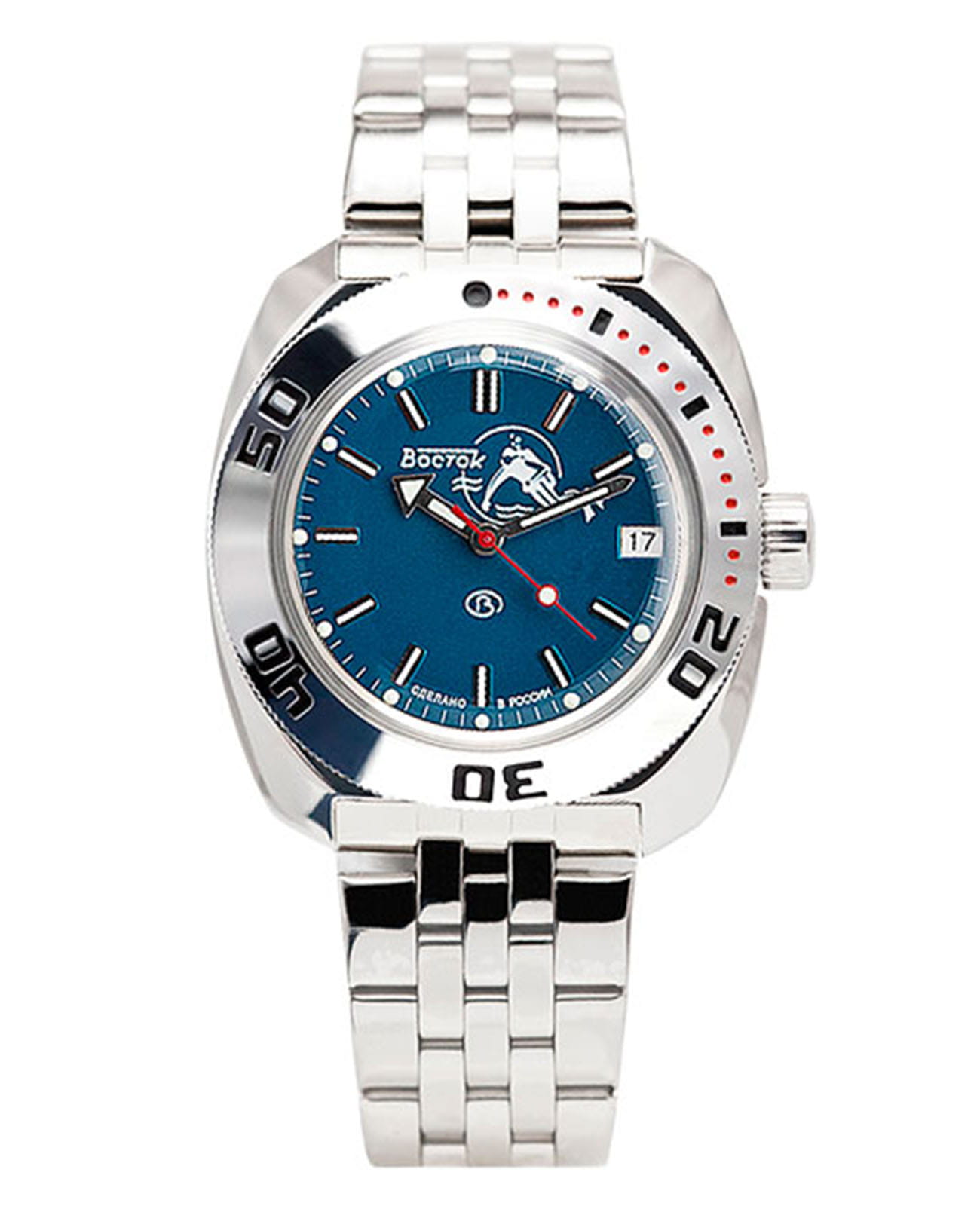 Наручные механические Часы Восток Амфибия Классика 710059. Механизм 2416 с автоподзаводом. Автоподзавод обеспечивает отсутствие необходимости завода наручных часов при постоянном ношении. Запас хода при полном заводе, не менее 31 час. Также есть ручной завод, можно вручную завести часы, если их не носили какое-то время до этого. Завинчивающаяся заводная головка из стали. Водозащита 200 метров, можно использовать для занятий дайвингом. Корпус изготовлен из высококачественной нержавеющий стали. Противоударное устройство оси баланса. Браслет с раскладывающейся застежкой.