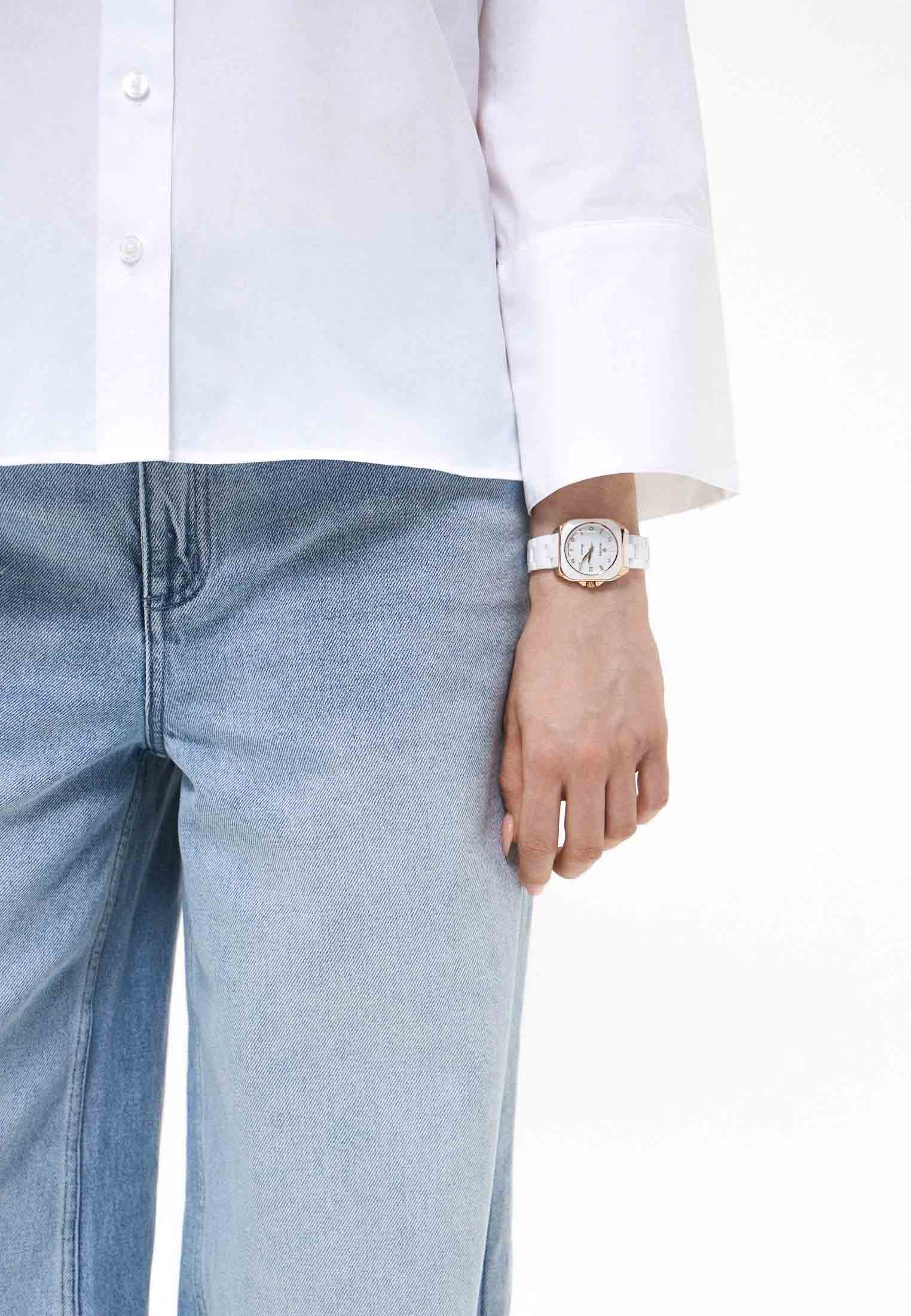 Женские кварцевые часы — это элегантный аксессуар, сочетающий в себе швейцарское качество и изысканный дизайн. Модель выполнена из нержавеющей стали марки 316L с керамической вставкой, что придаёт ей прочность и устойчивость к царапинам. Корпус имеет толщину 8,5 мм, а его размеры составляют 30 мм в диаметре. Циферблат белого цвета дополнен штриховыми метками и инкрустирован фианитами, что делает его привлекательным и выразительным. Защиту механизма обеспечивает сапфировое стеклоСапфировое стеклоПрочный и надёжный материал из кристалла сапфира синтетического происхождения, характеризующийся особой твёрдостью и устойчивостью к царапинам и повреждениям., устойчивое к повреждениям. Стальной браслет из керамики шириной 16 мм оснащён Раскладной замокРаскладной замокДанный вариант застежки используется только на часах с металлическим браслетом. Отличительная особенность такого крепления в том, что длина браслета становится универсальной и вы можете самостоятельно отрегулировать нужный вам размер – застежка просто двигается по браслету часов., обеспечивающей комфорт и надёжную фиксацию на запястье. Часы водонепроницаемы до 30 метров (, что позволяет использовать их при мытье рук или под лёгким дождём. Гарантия 2 года подтверждается гарантийным талоном, а срок действия начинается с момента передачи товара потребителю. Эти часы станут универсальным аксессуаром для тех, кто ценит сочетание стиля, функциональности и безупречного качества — идеальный выбор для повседневной носки и торжественных случаев.