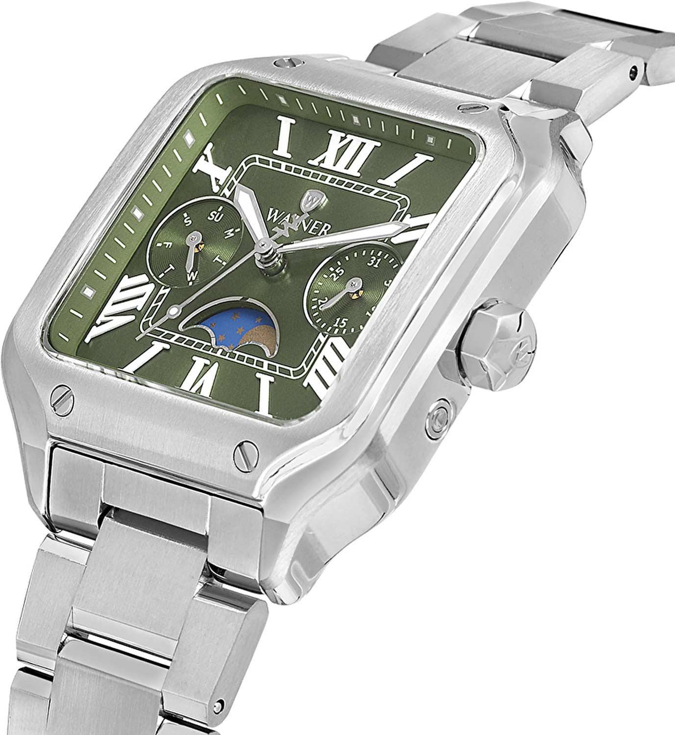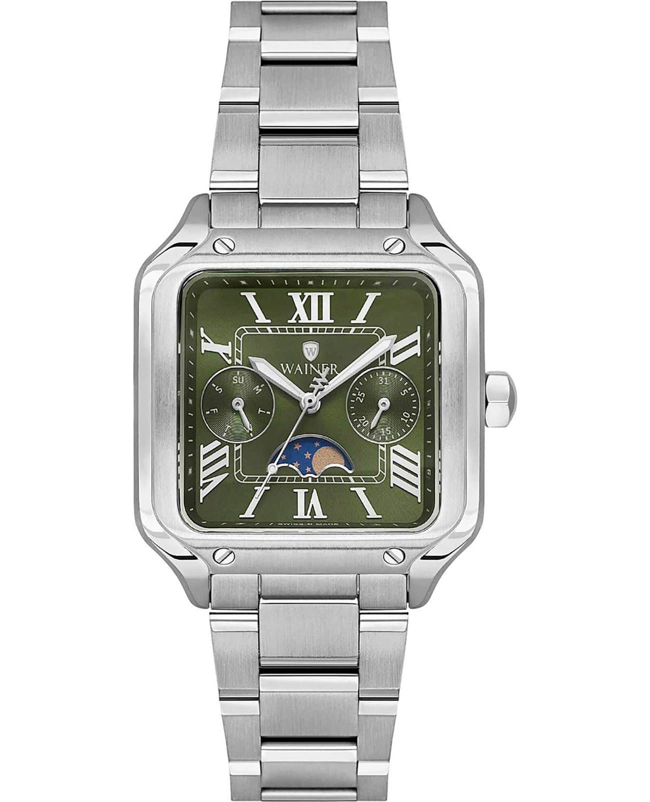 Женские кварцевые часы Wainer WA.18091-B — это стильный аксессуар, сочетающий в себе швейцарское качество и изысканный дизайн. Модель выполнена в квадратной форме из стали 316L с декоративными винтами, что придаёт ей прочность и устойчивость к царапинам. Циферблат дополнен штриховыми метками и римскими цифрами, а секундная стрелка на конце декорирована буквой W, подчёркивая внимание к деталям. Число, день недели и индикатор фазы Луны вынесены на отдельные циферблаты, что делает модель функциональной и выразительной. Защиту механизма обеспечивает сапфировое стеклоСапфировое стеклоПрочный и надёжный материал из кристалла сапфира синтетического происхождения, характеризующийся особой твёрдостью и устойчивостью к царапинам и повреждениям., устойчивое к повреждениям. Гранёная заводная головка с защитой оснащена фирменным логотипом, добавляя модели индивидуальности. Браслет из стали 316L шириной 16 мм оснащён Раскладная застёжкаРаскладная застёжкаТакой тип застёжки используется только на браслетах из металла. Она никогда не раскрывается полностью, происходит разделение на 2 и более частей. Раскладывающая застёжка снизит вероятность потери часов к минимуму., обеспечивающей комфорт и надёжную фиксацию на запястье. Водонепроницаемость позволяет использовать модель при мытье рук или под лёгким дождём. Стрелки с люминесцентным покрытиемЛюминесцентное покрытиеПозволяет считывать показания времени в темноте. Производители наносят на стрелки, часовые индексы, безель или поверхность циферблата светонакопительный состав, дающий холодное свечение. обеспечивают отличную читаемость даже в условиях слабого освещения. Механизм калибра Ronda 706.1 гарантирует точность хода и надёжность. Эти часы станут универсальным аксессуаром для тех, кто ценит сочетание стиля, функциональности и швейцарского мастерства — идеальный выбор для повседневной носки и торжественных случаев.